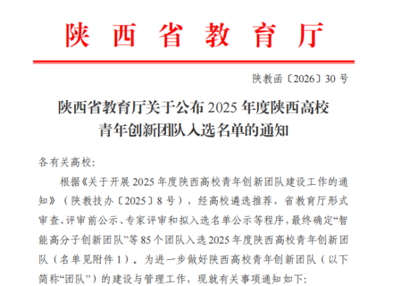 近日,陕西省教育厅公布《2025年度陕西高校青年创新团队入选名单的通知》(陕教函〔2026〕30号),由我校经济与管理学部王毅菲教授作为带头人申报的“数智赋能秦岭文化传播与文旅产业融合发展创新团队”成功入选2025年度陕西高校青年创新团队。
