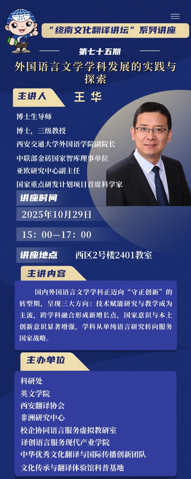 讲座主题:“终南文化翻译讲坛”系列讲座第七十五期——外国语言文学学科发展的实践与探索