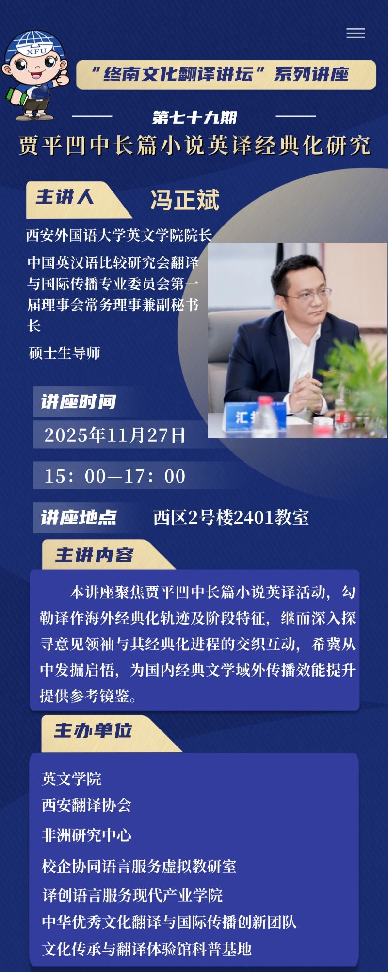 讲座主题:“终南文化翻译讲坛”系列讲座第七十九期——贾平凹中长篇小说英译经典化研究