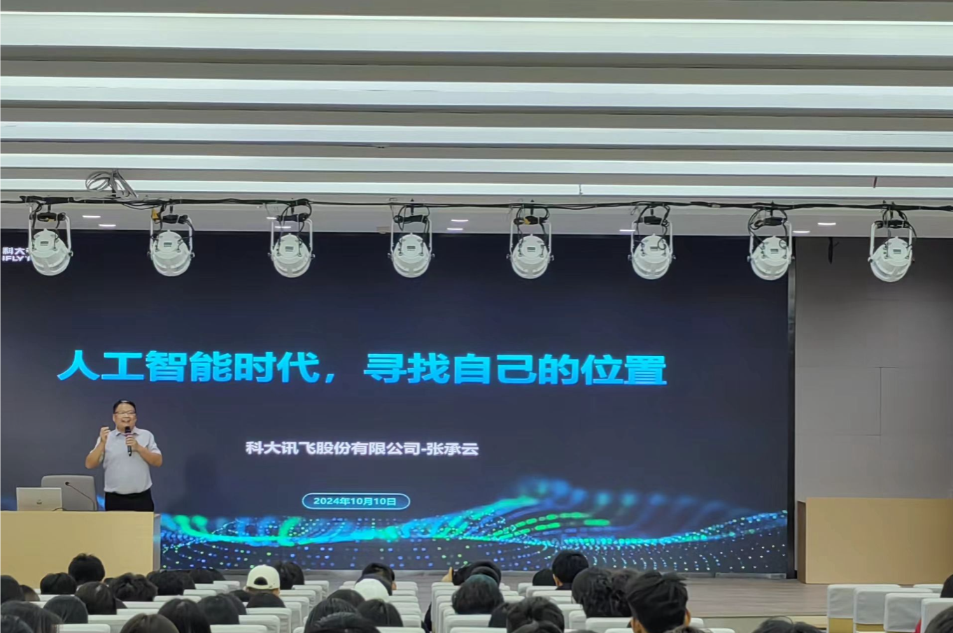 2024年10月10日晚,图书馆报告厅内一场题为“人工智能时代,寻找自己的位置”的讲座拉开帷幕。讲座特邀科大讯飞聆智科技副总经理张承云担任主讲,旨在为我校人工智能专业的学生们点亮一盏明灯,指引他们更深入地了解专业,认真学习,规划未来。讲座现场座无虚席,人工智能专业全体专职教师、辅导员以及2023级和2024级的全体学生齐聚一堂。