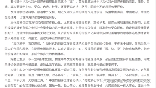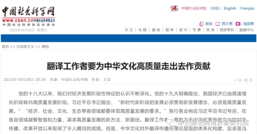党的二十大召开之际,我院王淙院长应中国社会科学网之约,在该网“马克思主义”栏目发表重要文章《翻译工作者要为中华文化高质量走出去作贡献》。