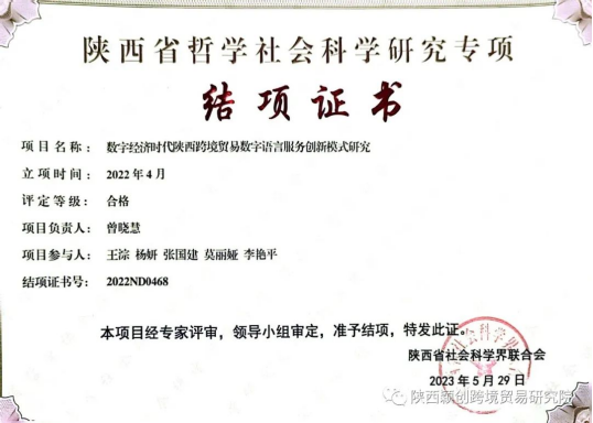 目前我院承担的2023年陕西省哲学社科研究专项青年项目已按时完成研究工作,已提交了结题申请。参与的由西安音乐学院主持的一项外语专项联合研究任务开展顺利,已发表阶段性成果。