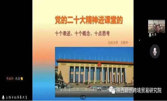 党的二十大召开后,陕西颖创跨境贸易研究院欢欣鼓舞,热议二十大给中国带来的光辉前景和光明未来。为了宣传贯彻会议精神,结合研究院人员主要为来自高校的兼职人员的工作实际,2022年10月29日上午9时,研究院党支部组织全体党员线上聆听了兰州大学马克思主义学院王维平教授所作的《党的二十大精神进课堂的十个表述、十个概念、十点思考》专题辅导报告。